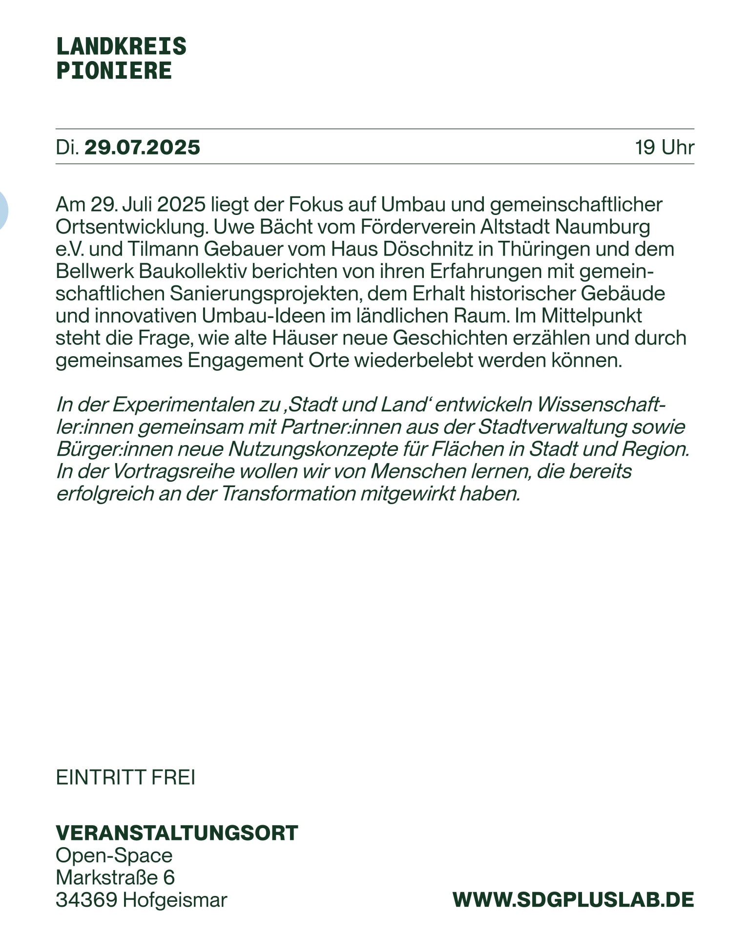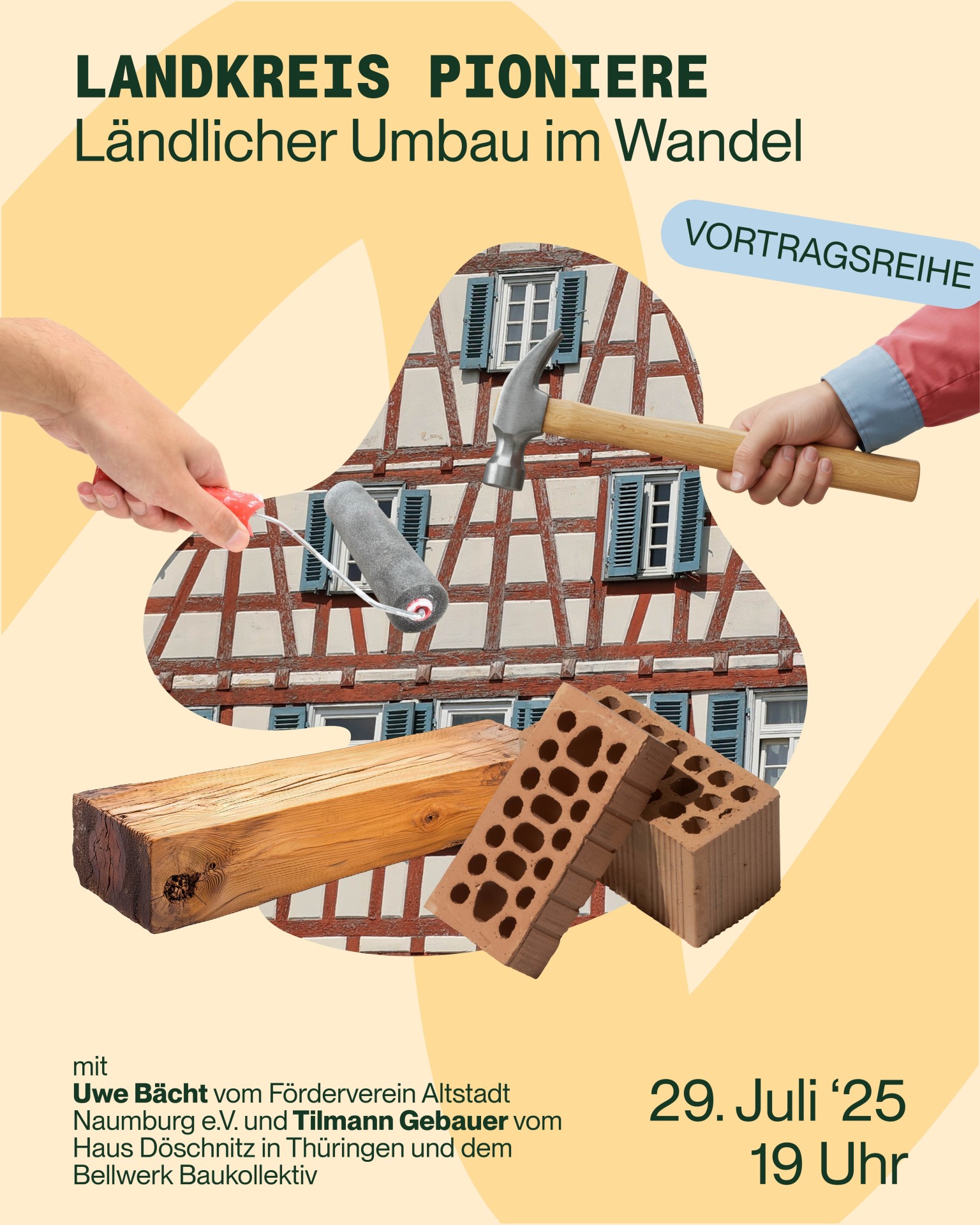 Am 29. Juli 2025 liegt der Fokus auf Umbau und gemeinschaftlicher Ortsentwicklung. Uwe Bächt vom Förderverein Altstadt Naumburg e.V. und Tilmann Gebauer vom Haus Döschnitz in Thüringen und dem Bellwerk Baukollektiv berichten von ihren Erfahrungen mit gemeinschaftlichen Sanierungsprojekten, dem Erhalt historischer Gebäude und innovativen Umbau-Ideen im ländlichen Raum. Im Mittelpunkt steht die Frage, wie alte Häuser neue Geschichten erzählen und durch gemeinsames Engagement Orte wiederbelebt werden können.