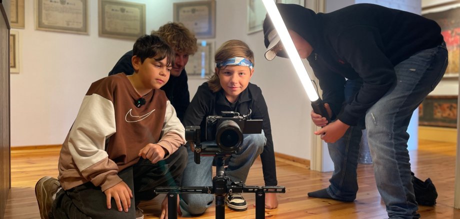 Zum Kennenlernen der verschiedenen Themen im Stadtmuseum Hofgeismar gab es zu Beginn einen Rundgang mit Museumskoordinatorin Katharina Zeller. Die ersten Ideen formten sich und es ging direkt los mit der Themenfindung, weiteren Recherchen und dem Schreiben des Drehbuchs. In Kleingruppen widmeten sich die Kinder den einzelnen Ausstellungsthemen und übernahmen dabei abwechselnd die Aufgaben von Moderation, Kameraführung und Regie. Das Ziel, einen kindgerechten und spielerischen Film zu drehen, stand dabei stets im Vordergrund. „Die Kinder werden ermutigt, aktiv und kreativ tätig zu werden, alle Aufgaben selbst zu übernehmen, wobei wir als Betreuer stets unterstützend im Hintergrund stehen und bei der Umsetzung der Ideen behilflich sind“, erläutert Medienpädagoge und Kameramann Gabriel Chiarello vom Verein „Zeit für Kinder“.