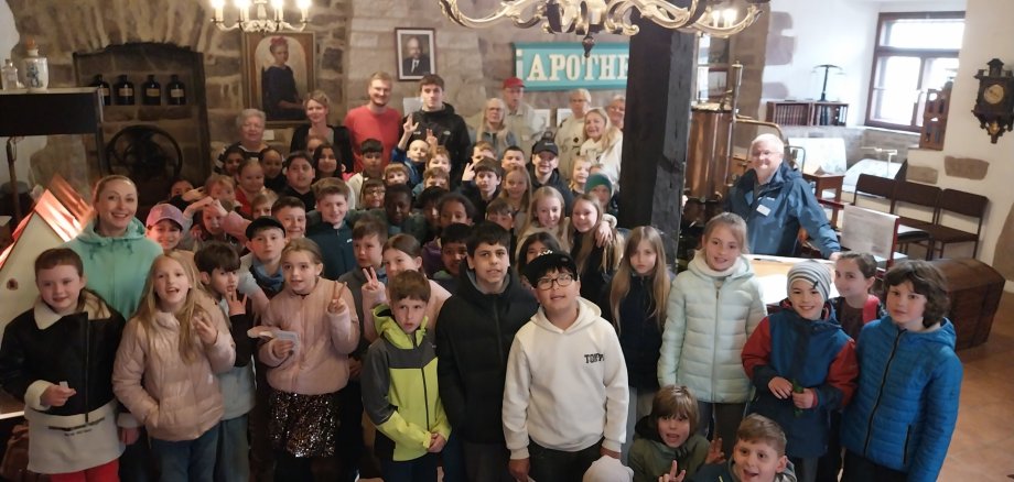 An 6 verschiedenen Stationen wurde den Schülern ein Einblick in die Welt der Apotheken gegeben. So wurde anhand einer Zeitachse, das Alter des Steinernen Hauses, erbaut um 1239, mit dem Alter der Kinder, Ihrer Eltern und Großeltern, die Eröffnung des Apothekenmuseums und verschiedene Nutzungen des Hauses erläutert. Auch das Bestellwesen und die Funktion einer Dezimalwaage wurden erläutert. Der Begriff „Pillendreher“ konnte anhand eines Pillenbrettes selbst ausprobiert werden. In der ehemaligen Sanderschen Hirschapotheke wurde der Name mit Hirsch-, Elch- und Rehgeweihen dargestellt und erläutert, dass aus Geweihen des sog. Hirschhornsalz zu Heilzwecken gewonnen wurde. Im der „Alchimistenküche“ wurde die Destillation, die Zerkleinerung, das sog. „Anstoßen“ von Pflanzen und die Tablettenmaschinen gezeigt und selbst bedient. Im Apothekergarten konnten die Kinder Pflanzen erkennen und probieren.